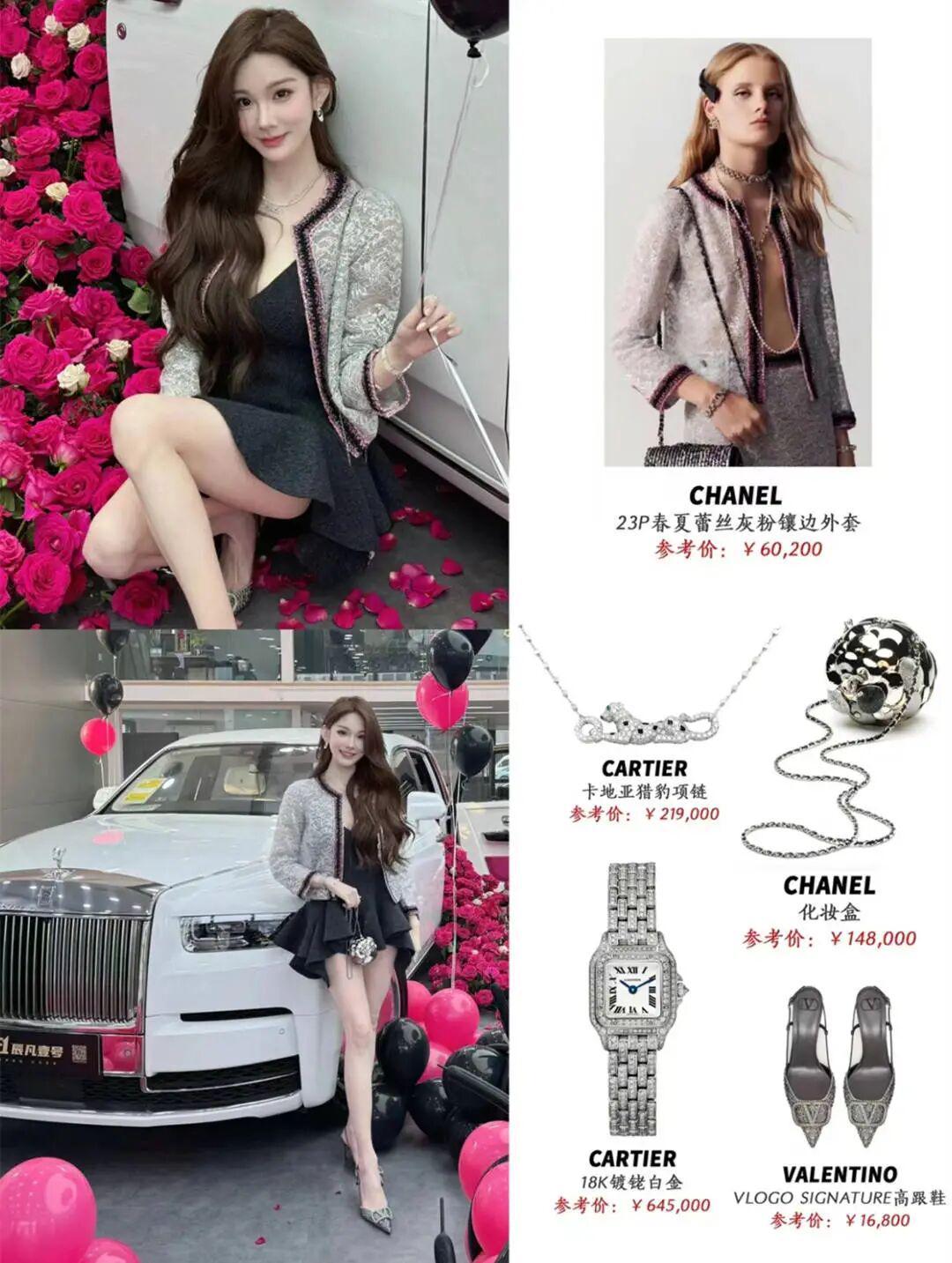 再看花三三提车时这身装备,6万2的小香外套搭配1万6的VALENTINO高跟鞋,脖子上戴的是卡地亚豹纹项链,价值21.9万,背的包包是香奈儿首饰盒,专柜售价14万8.
