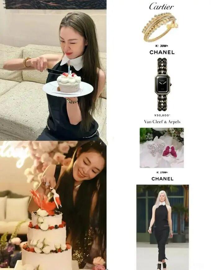 最贵的是她手腕上的名表,18K镀白金卡地亚,公价64万5千。